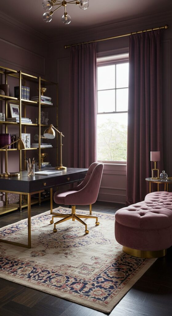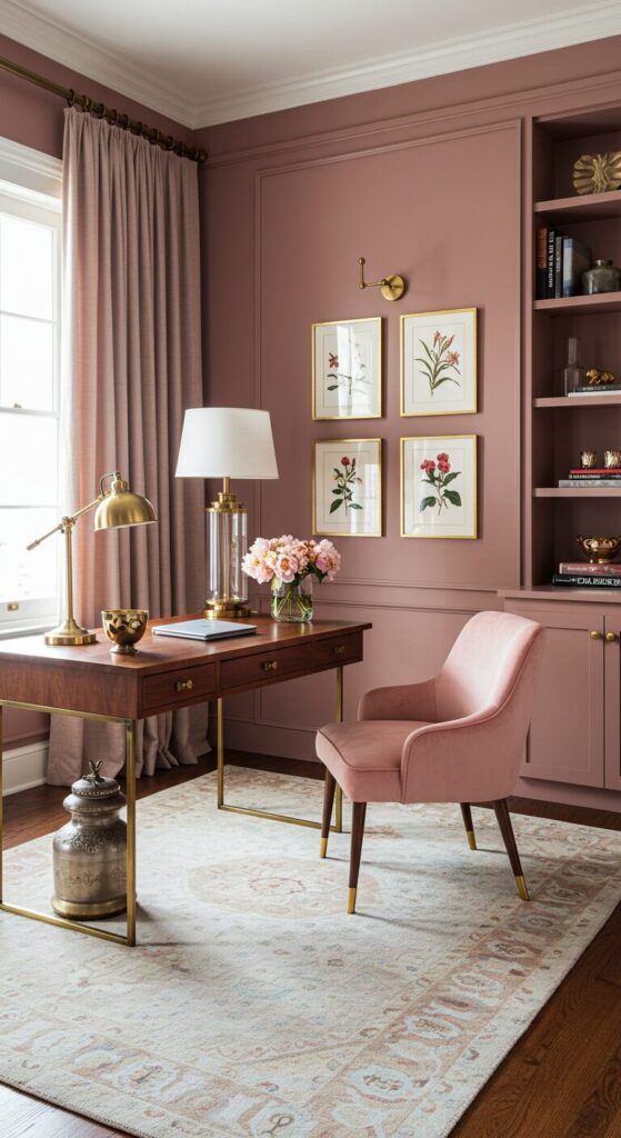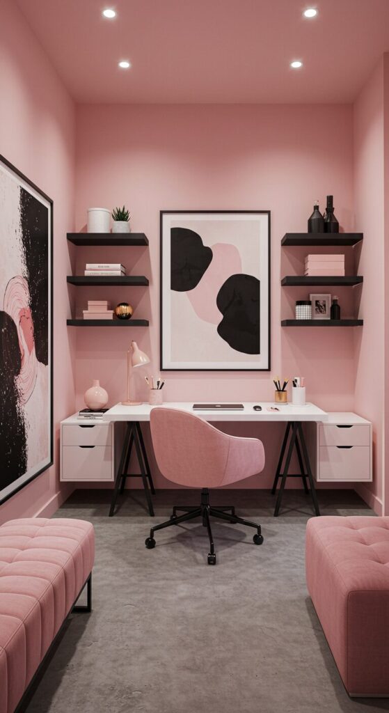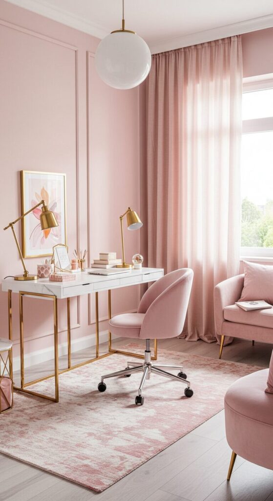 Layer different pink tones through curtains, cushions, and desk accessories to add depth without overwhelming the space.