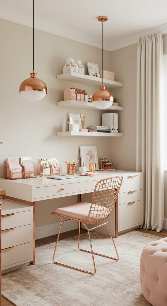 Balance rose gold elements with neutral walls and soft fabrics to avoid an overly busy appearance.