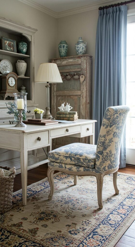 Distressed furniture and vintage accessories create a collected-over-time look that feels personal and warm.