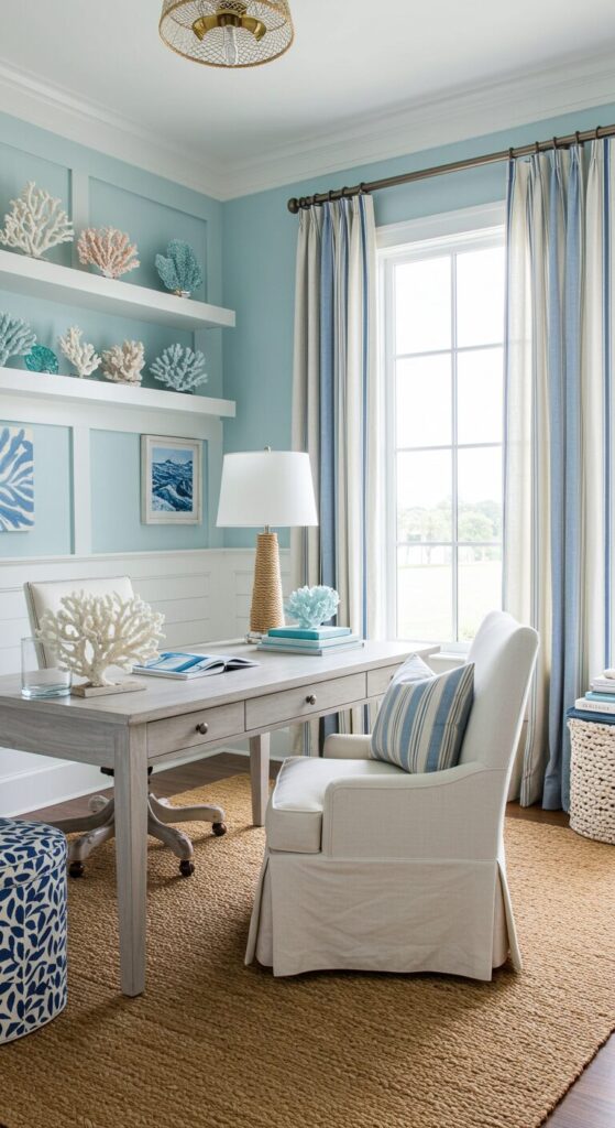 Light blues and sandy neutrals create a breezy atmosphere that promotes calm focus.