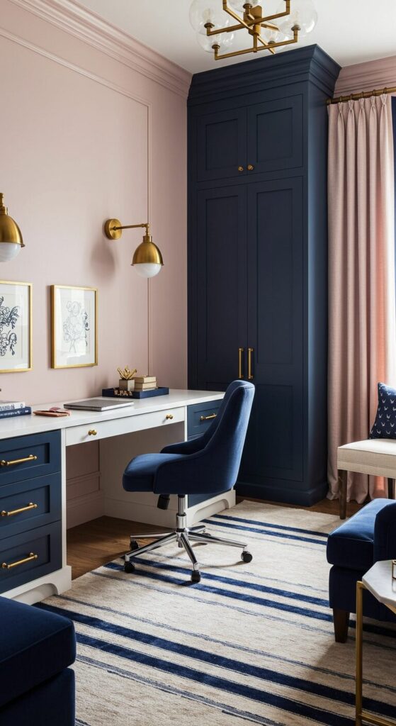 Navy blue grounds feminine blush tones for a balanced, sophisticated color scheme.