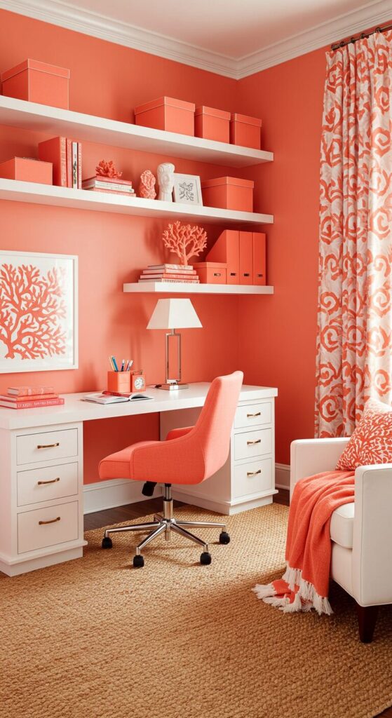 Balance coral walls with neutral furniture to prevent the space from feeling overwhelming.