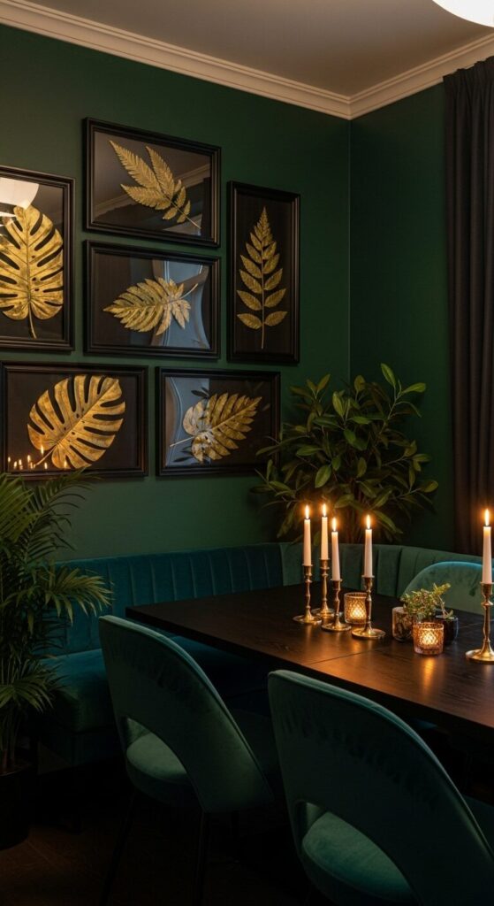 Emerald green walls ground a dramatic cluster of oversized matte black frames showcasing lush fern and monstera leaves in rich greens and golds. Dim sconce lighting casts soft glows across velvet textures, turning the wall into a jewel-toned jungle that feels intimate and luxurious.