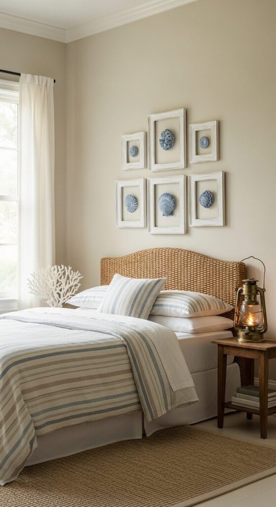 Soft sandy beige walls frame a symmetrical arrangement of whitewashed wood frames filled with vintage seashell illustrations and faded blue hydrangea prints. Wicker accents and rope details nod to the shore, while sunlight streams through gauzy curtains, filling the room with a breezy, nostalgic charm.