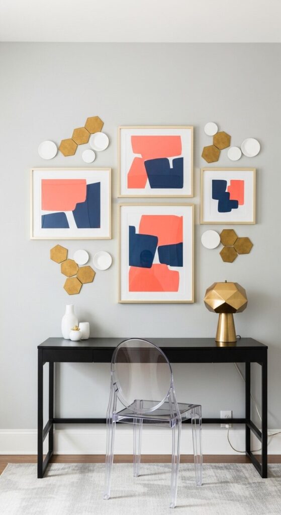 Crisp gray walls feature a playful asymmetric mix of hexagonal brass frames and circular white ones holding bold abstract shapes in coral, mustard, and navy. Track lighting highlights the metallic edges, giving the arrangement a fresh, gallery-like energy that sparks conversation.