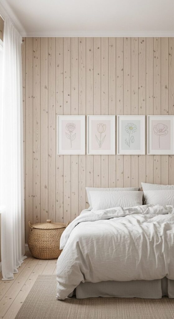 Pale birch walls host a single horizontal line of slim white frames with delicate line-drawn wildflowers in muted pastels. Soft northern light pours in, amplifying the airy, uncluttered peace of Scandinavian design.