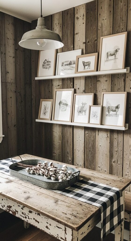 Reclaimed barn wood walls showcase a casual leaning ledge gallery of distressed white frames with black-and-white farm animal sketches and handwritten-style quotes. Edison bulbs in mason jar sconces cast a golden glow, filling the space with down-home comfort.