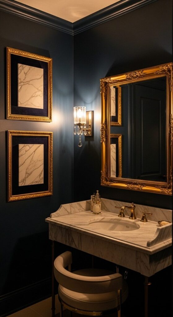 Midnight navy walls frame a sultry salon of velvet-matted gold frames with marbleized paper and inkblot abstracts in cream and gold. Crystal sconces cast diamond light patterns, creating a decadent, old-Hollywood glamour that begs for candlelit evenings.