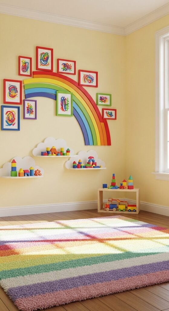 Butter-yellow walls burst with a rainbow arc of colorful plastic frames holding finger-paint masterpieces and alphabet art in primary hues. Playful cloud shelves float nearby, bathed in cheerful afternoon light that makes the room feel like pure sunshine.