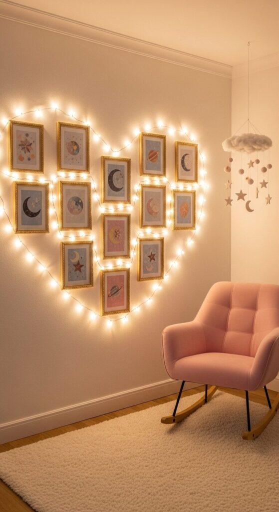 Ivory walls glow with a heart-shaped cluster of thin gold frames intertwined with warm fairy lights, holding soft pastel illustrations of moons and stars. Twinkling lights reflect off metallic edges, creating a dreamy, enchanted nook perfect for bedtime stories.