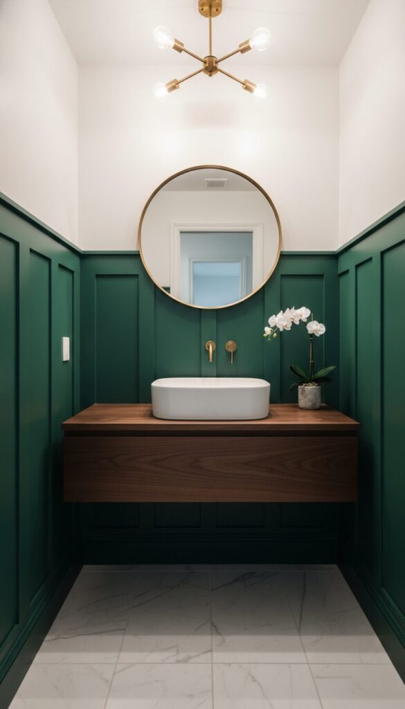 Make a bold statement in a small powder room with dark half wall paneling. Opt for deep hues like charcoal, forest green, or even black for a dramatic and luxurious effect.