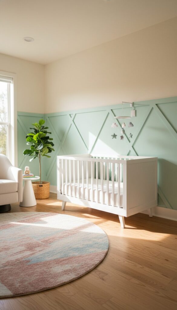Infuse a playful yet stylish vibe into a nursery with geometric half wall paneling. This can involve using thin wood strips to create abstract shapes like triangles, squares, or even herringbone patterns on the lower portion of the wall.