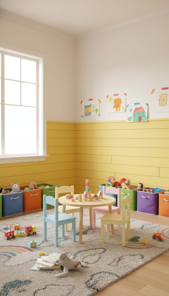 Inject vibrant energy into a kids’ playroom with colorful half wall paneling. This idea allows for a playful exploration of color, using bright hues like sunny yellow, sky blue, or cheerful orange on the paneling.