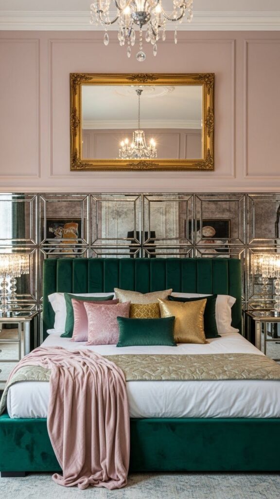 For an infusion of glamour and an illusion of expanded space, consider mirrored half wall paneling in a bedroom.