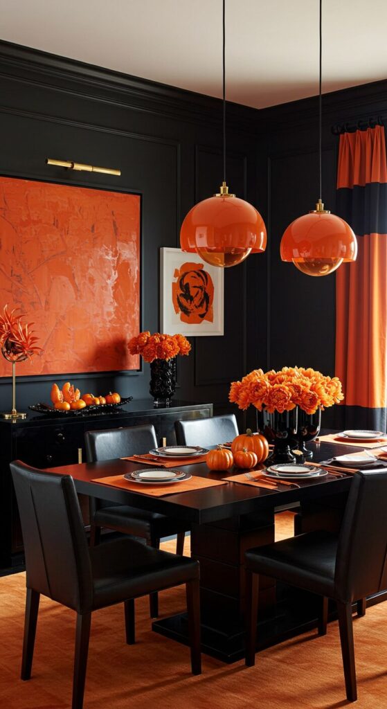 Elevate the traditional Halloween color scheme by using black as your dominant color with strategic orange accents. Paint walls deep black and invest in sleek black dining furniture.
