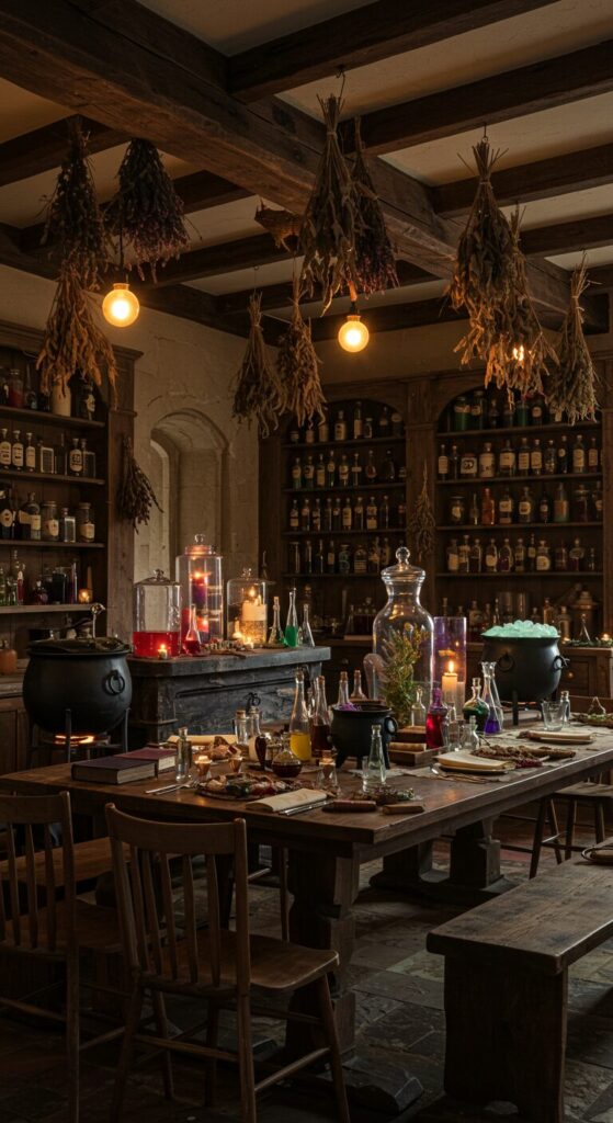 Hang dried herbs from ceiling beams and scatter old books around the table. The room should feel like an active magical workspace rather than just decorated for Halloween.