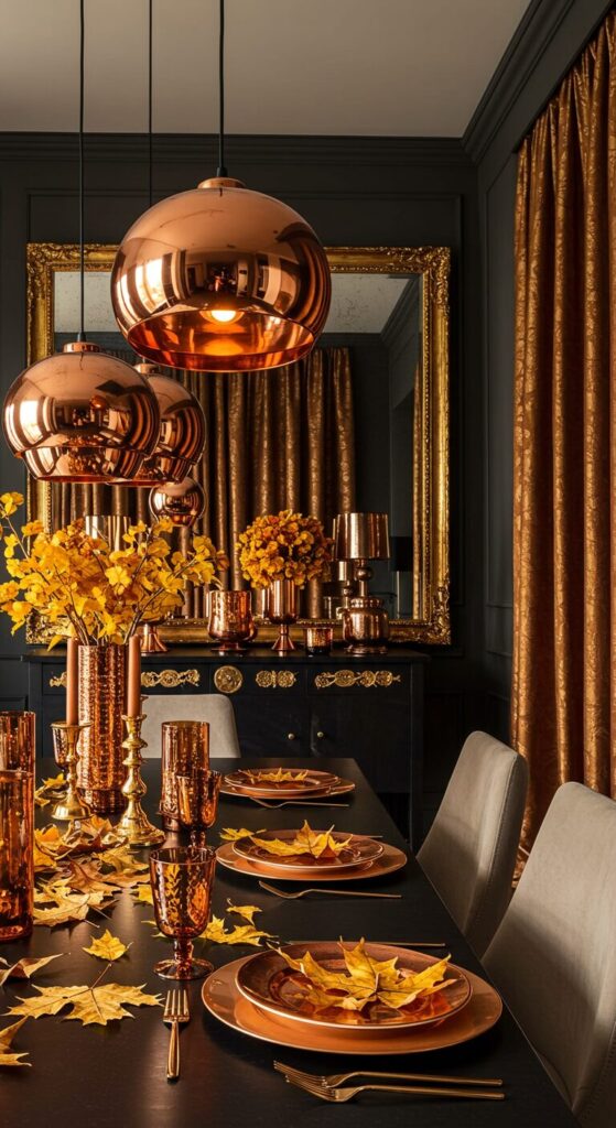 Create opulent autumn elegance by using copper and gold as your dominant metals throughout the room. Copper pendant lights and golden mirror frames establish the luxurious foundation.