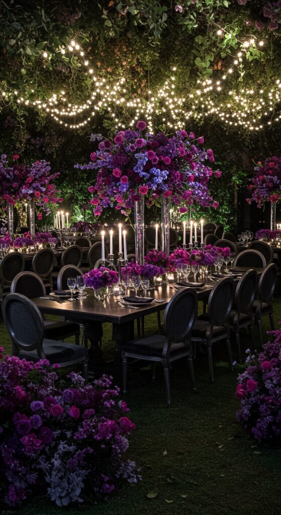 Create an enchanting nighttime garden atmosphere using deep purple flowers and abundant greenery throughout the room. Fairy lights overhead mimic stars in a midnight sky.