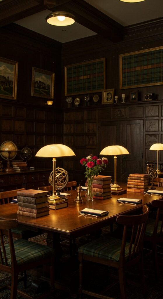 Banker’s lamps provide focused lighting while tartan patterns in deep colors add academic authenticity. The room should feel like where important discoveries are discussed over dinner.