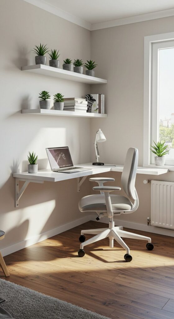 Corner spaces are often wasted, but they’re perfect for a compact workspace. A floating desk mounted at the intersection of two walls creates an L-shaped work area without consuming floor space.