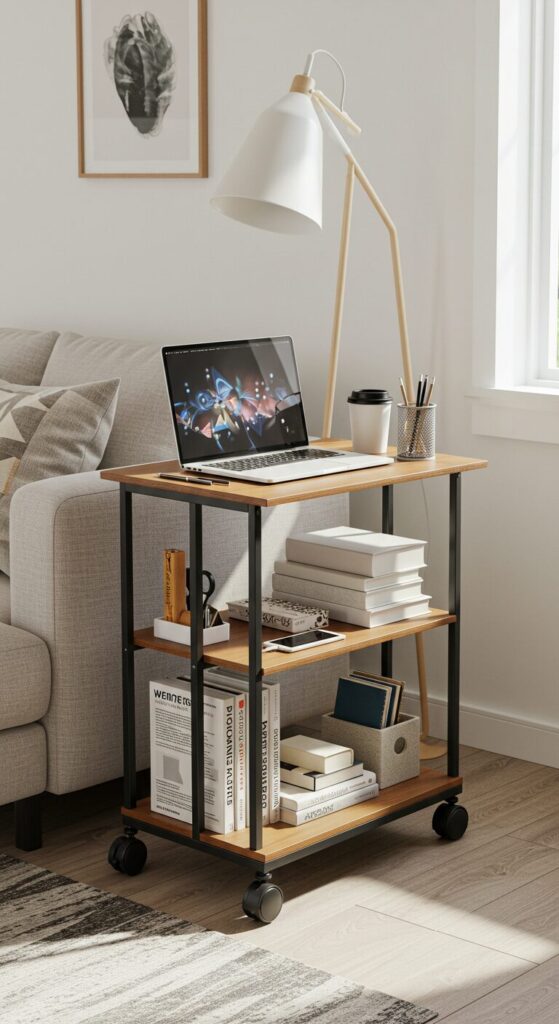 A multi-tiered rolling cart serves as a mobile office that tucks away anywhere. Use the top tier as your work surface and lower levels for supplies and equipment.