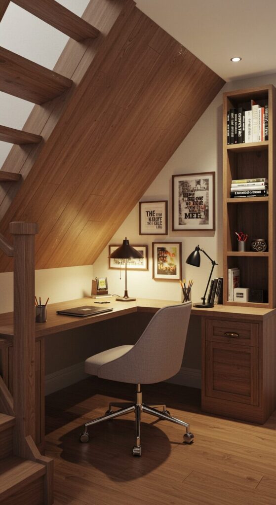 The triangular space beneath staircases is often underutilized. Install a custom desk that follows the sloped ceiling line for a cozy, built-in workstation.