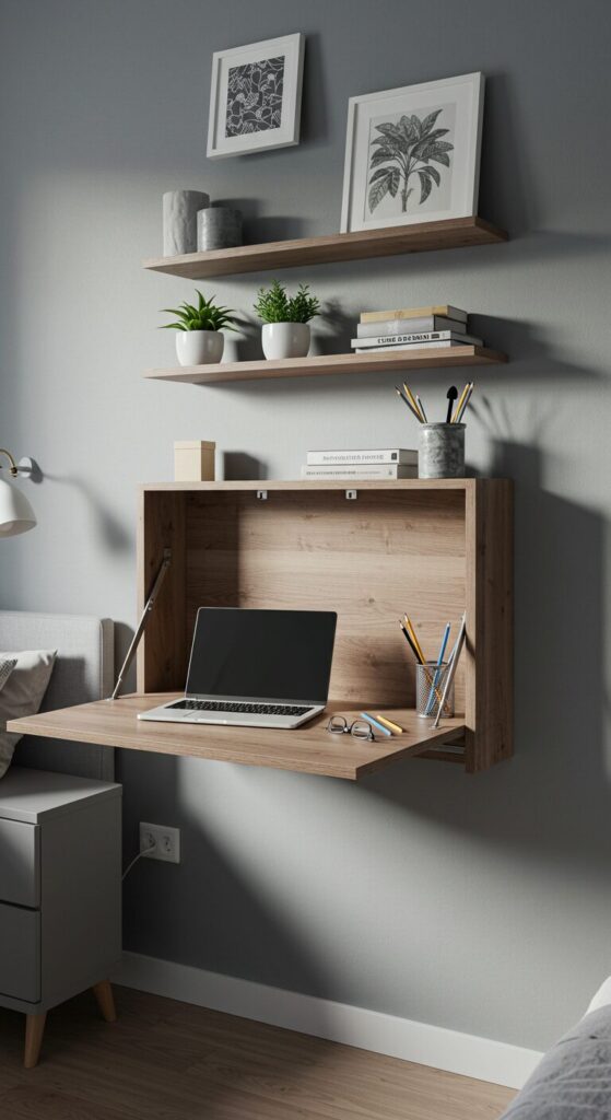 Install a simple fold-down desk that sits completely flat against the wall when not needed. Add a built-in support leg that swings out for stability.