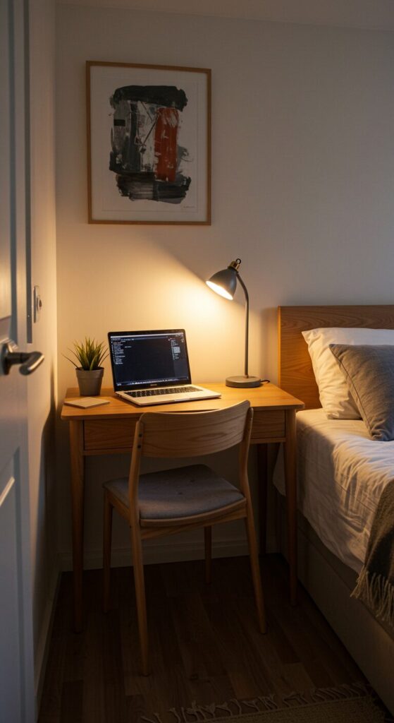 Position a narrow desk alongside your bed to create a dedicated workspace without sacrificing bedroom functionality. Use the same aesthetic as your bedroom furniture for cohesion.