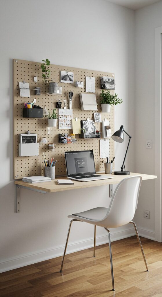 Maximize vertical space with a pegboard or slatwall system above a narrow desk. This keeps supplies accessible without cluttering your limited surface area.