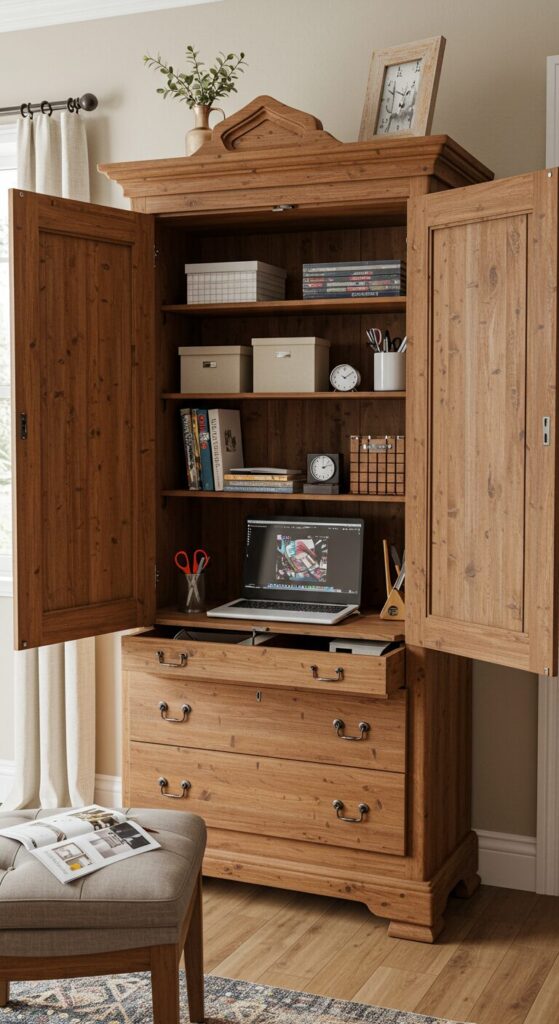 Repurpose a vintage armoire into a hidden office. Remove or adjust internal shelving to accommodate your computer and supplies, then close the doors when work ends.
