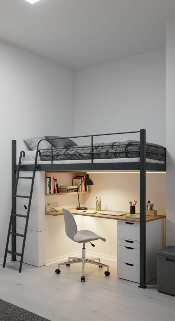 The raised sleeping area creates a distinct separation between rest and work zones. This psychological boundary helps maintain better work-life balance.