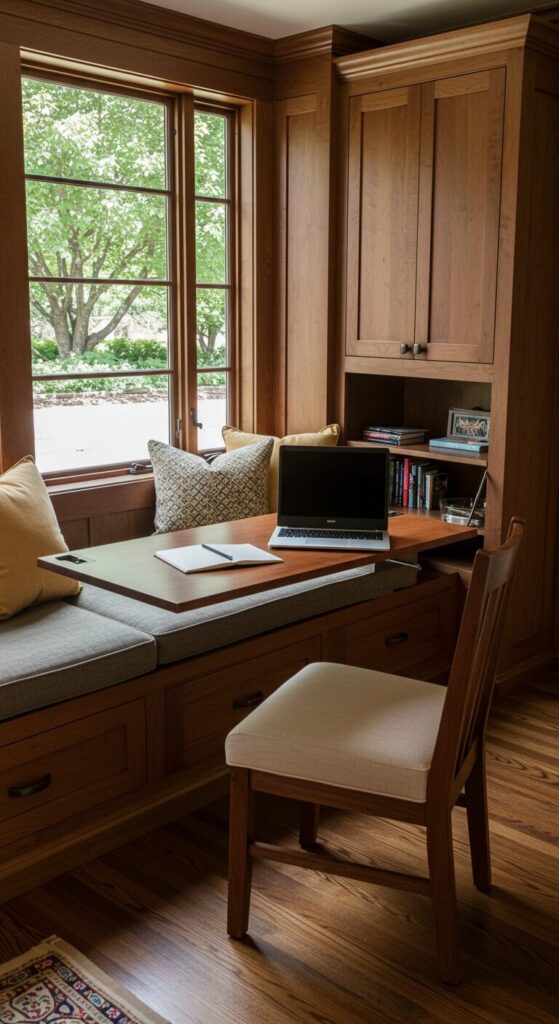 Combine a window seat with a fold-out desk surface for a multifunctional space. The seat provides storage underneath while doubling as your office chair.