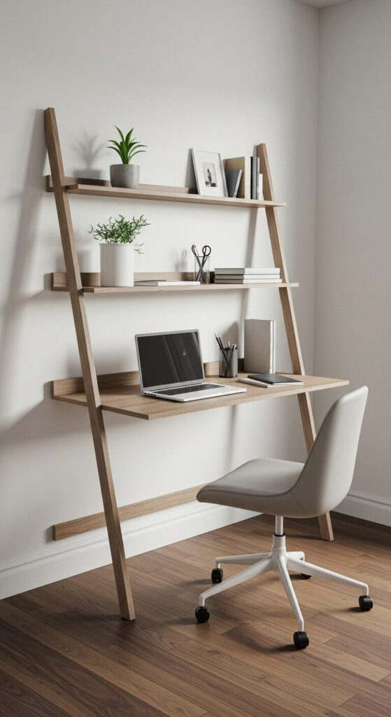 A ladder-style leaning desk requires minimal floor space while providing multiple shelves for storage. These prop against the wall at an angle, creating surprising stability.