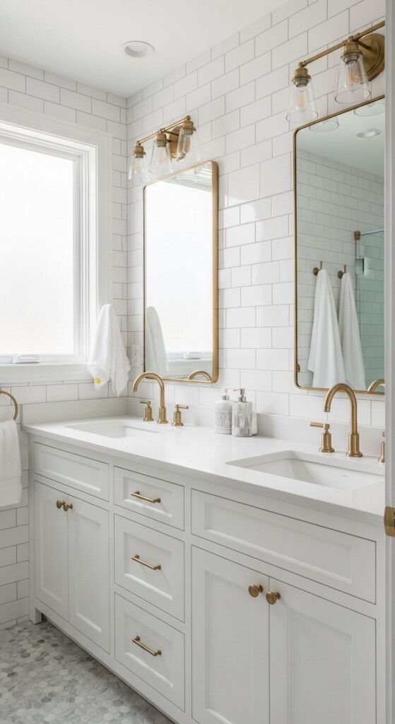 Choose white shaker-style cabinets for storage that hides clutter, and add small brass trays on the counter to corral everyday essentials. The beauty of this palette is that it pairs with literally any towel color or decor accent you want to switch in later.