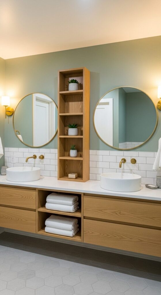 Imagine walls painted in the softest sage green—the kind that makes you exhale the moment you walk in. A floating vanity in light oak brings warmth and modern simplicity, while white vessel sinks sit like little sculptures on top.