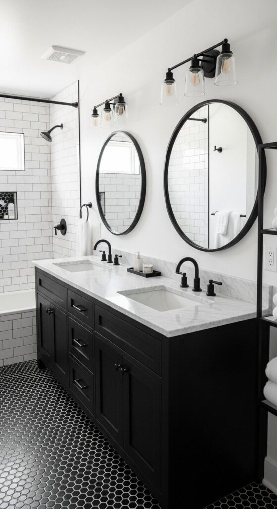 Black hexagon floor tiles create geometric interest underfoot, and the white grout lines turn the floor into functional art. This high-contrast approach works brilliantly in Jack and Jill bathrooms because it feels equally sophisticated to both users—there’s nothing cutesy or juvenile about it.