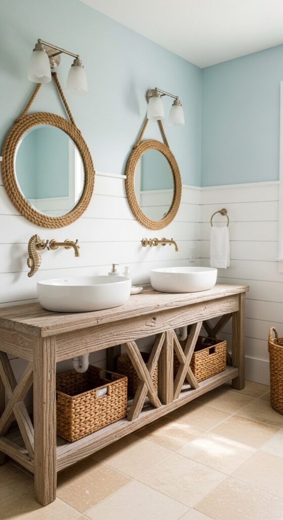 This bathroom feels like a gentle ocean breeze—pale blue walls meet weathered driftwood, and suddenly you’re mentally on vacation. The driftwood vanity brings texture and coastal character without feeling too themed, while rope-wrapped mirrors nod to the beach house vibe in the subtlest way.