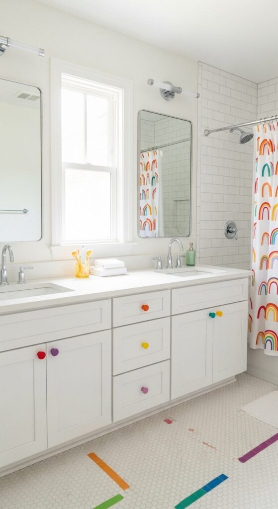 Here’s where sharing a bathroom gets genuinely fun—rainbow drawer pulls march across a white double vanity like little bursts of joy. The base stays clean and simple with white walls and subway tiles, letting those colorful accents do all the personality work.