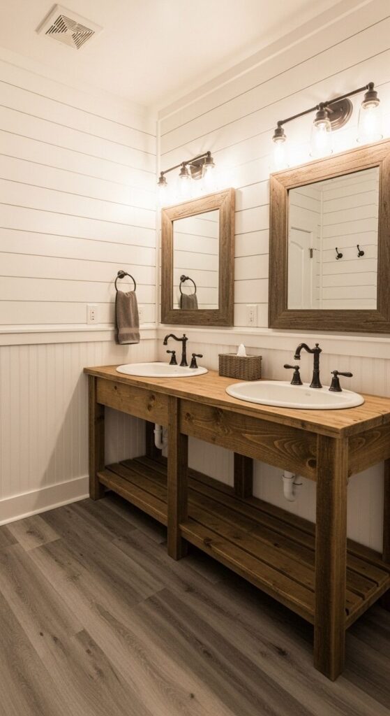 Shiplap wraps this bathroom in farmhouse coziness—the kind that feels collected over time rather than decorated all at once. The reclaimed wood vanity brings character and warmth, with enough natural variation that it hides wear beautifully (perfect for a shared space).