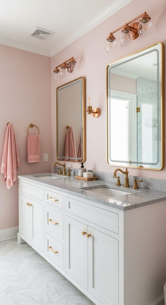 Blush pink wraps this bathroom in soft luxury—not little-girl pink, but a sophisticated dusty rose that feels grown-up and glamorous. The marble countertops with waterfall edges add a hotel-like quality, while gold fixtures catch the light and make everything feel a bit more special.