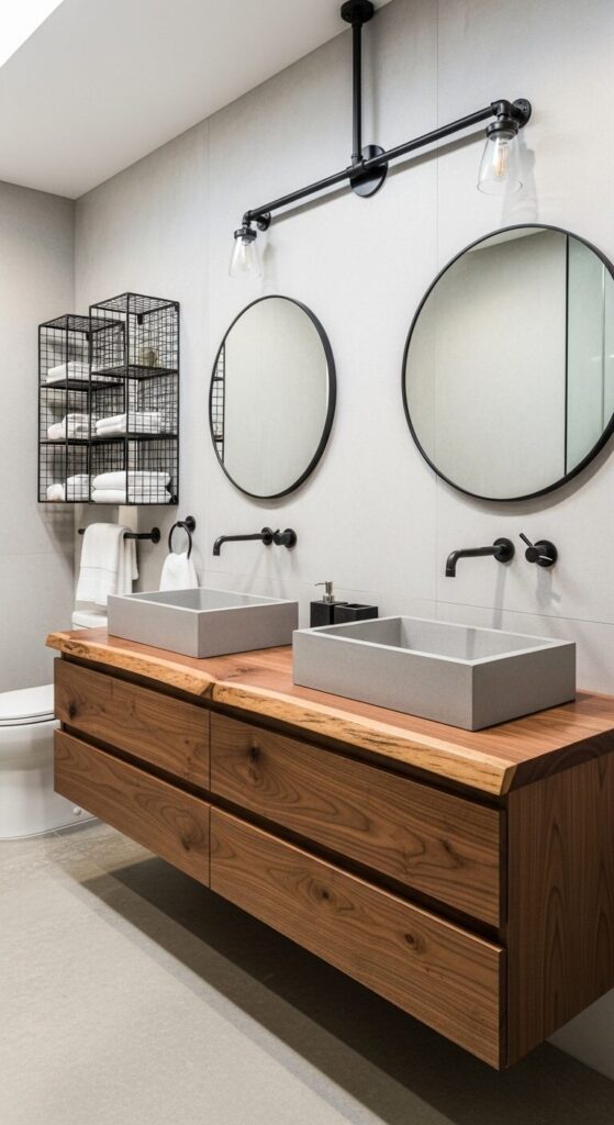 Concrete meets warm walnut in this unexpectedly cozy industrial space—the kind that feels downtown loft cool but still totally functional. The live-edge wood vanity adds organic warmth that softens the concrete surfaces, while vessel sinks made from concrete itself tie the material story together.