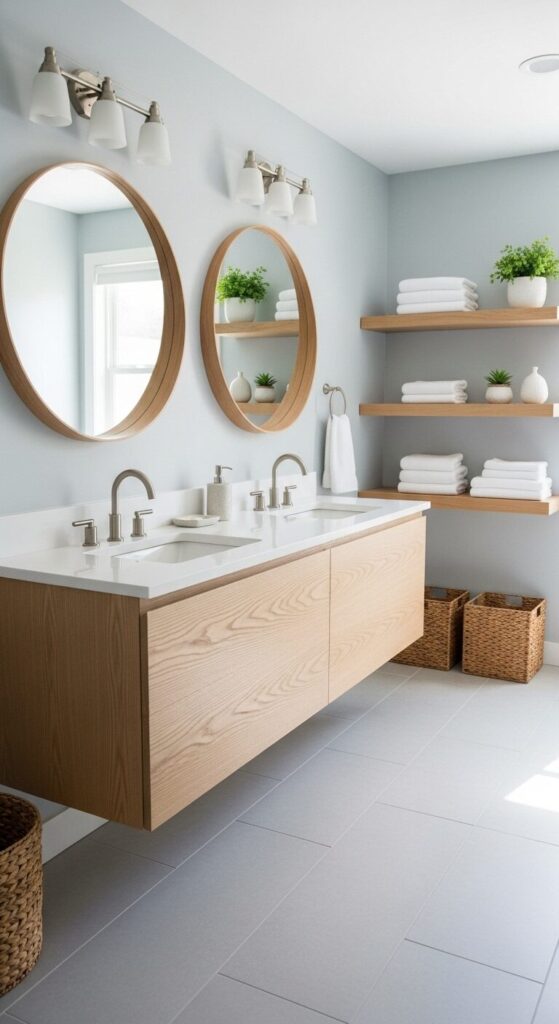 The color palette stays cool and calming, which helps when two people are trying to get ready at the same time. Add woven baskets for storage and keep accessories in whites, blues, and natural materials to maintain the breezy feel.