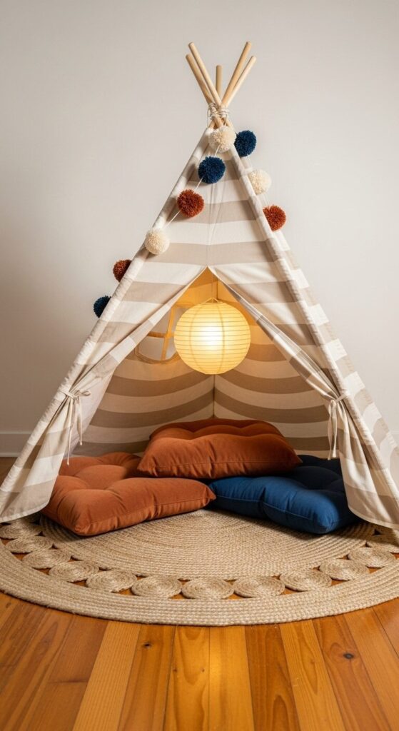A canvas teepee in oatmeal stripes stands over a round jute rug. Inside, floor cushions in terracotta, mustard, and indigo create a sunset palette. Tiny pom-pom garlands sway from wooden poles, catching the glow of a paper lantern.