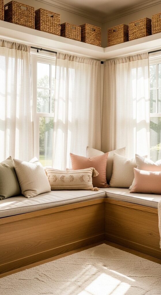 Soft ivory linen drapes frame a built-in bench piled with blush, sage, and butter-yellow pillows. Natural oak shelves hover above, holding woven baskets of picture books. Afternoon light pools on a fuzzy cream rug, making the whole nook glow like a secret garden.