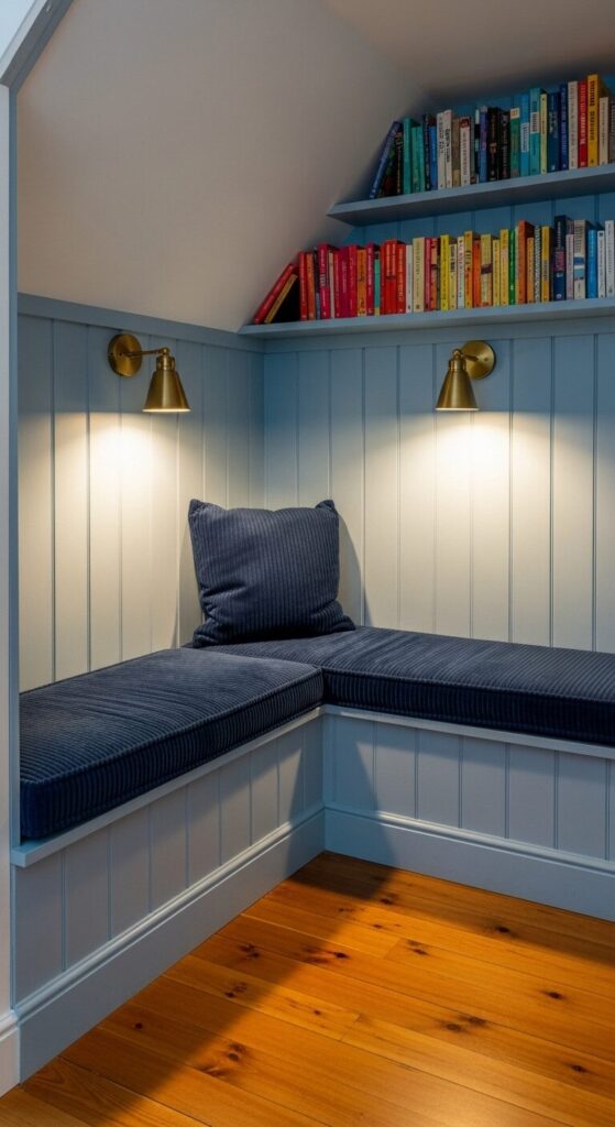 Tongue-and-groove paneling painted pale sky blue wraps a triangular nook beneath the stairs. A built-in bench wears a navy corduroy cushion; brass wall sconces cast warm pools of light onto open shelves of colorful spines.