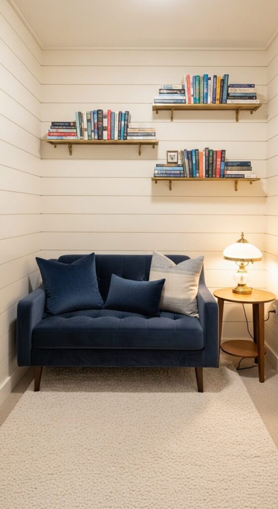 Sliding doors removed, a reach-in closet becomes a pint-size library. Shiplap walls in creamy white meet a mini navy velvet loveseat. Brass picture ledges display rotating favorites; a tiny round table holds cocoa and crayons.