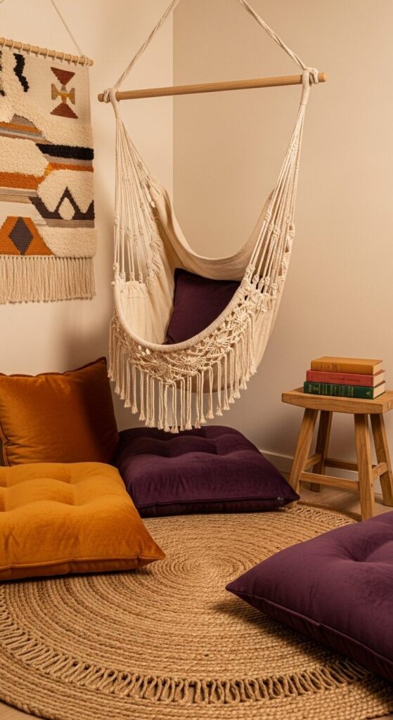 A low macramé hammock chair swings beside a mountain of floor pillows in ochre, plum, and sage. Woven wall hangings and a rattan rug create desert-nomad vibes. A low teak stool holds a stack of graphic novels.