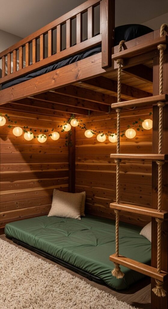 A loft bed’s underside becomes a secret den with cedar plank walls and faux ivy garlands. A low futon mattress wears forest-green linens; paper lantern string lights mimic fireflies. A rope ladder dangles invitingly.