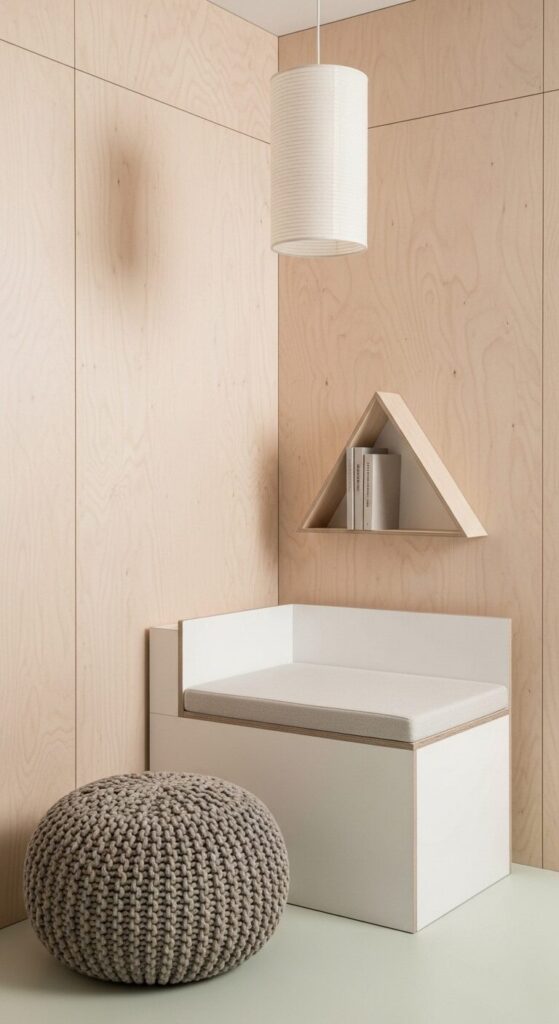 Clean lines reign: a low white cube seat, pale birch plywood walls, and a single oversized knit pouf in oatmeal. A triangular shelf holds just three curated books. Soft daylight filters through a rice-paper shade.