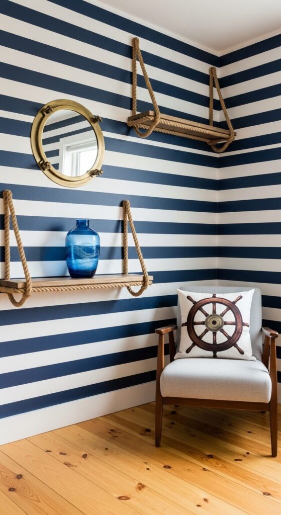 Paint one accent wall in wide horizontal stripes using painter’s tape. Knot jute rope around basic shelves for instant maritime charm. Add a blue-glass bottle vase with dried sea grass.